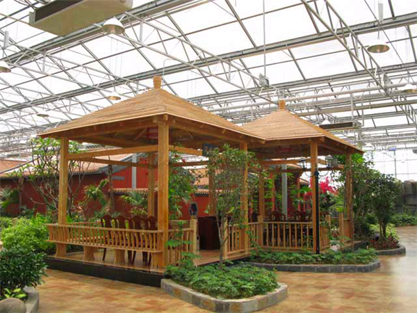 綠色生態(tài)餐廳完全按照標(biāo)準(zhǔn)溫室的結(jié)構(gòu)建造,多采用文洛式,覆蓋材料多為PC板或者玻璃,結(jié)構(gòu)保溫性能好,整齊規(guī)范,室內(nèi)各個(gè)空間溫度均勻,有利于景觀植物的生長(zhǎng),鑒于餐飲布局的需要,在文洛溫室結(jié)構(gòu)的基礎(chǔ)上,可進(jìn)行局部調(diào)整。該溫室建造成本相對(duì)較低,溫室升降溫能耗低,節(jié)約后期運(yùn)行費(fèi)用。
