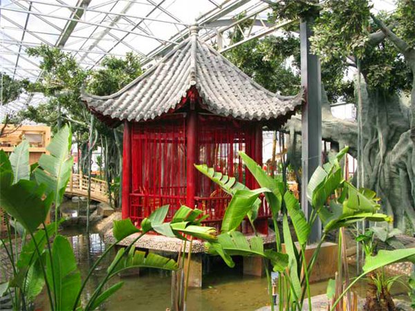 綠色生態(tài)餐廳完全按照標準溫室的結構建造,多采用文洛式,覆蓋材料多為PC板或者玻璃,結構保溫性能好,整齊規(guī)范,室內各個空間溫度均勻,有利于景觀植物的生長,鑒于餐飲布局的需要,在文洛溫室結構的基礎上,可進行局部調整。該溫室建造成本相對較低,溫室升降溫能耗低,節(jié)約后期運行費用。